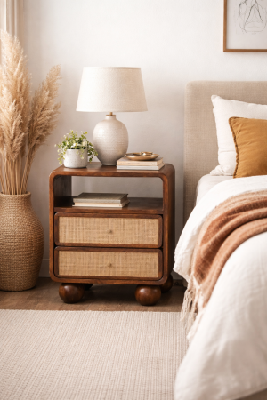 Larissa 2 Drawer Chestnut Nightstand – Solid Mango Wood Bedside Table with Rattan Drawers