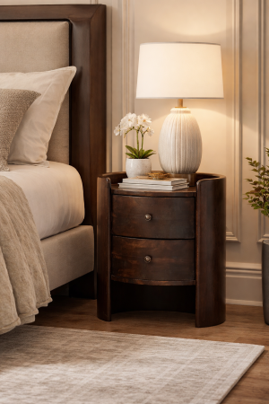 Velvet Mocha Round Side Table – Solid Hardwood Bedside Table with Drawers