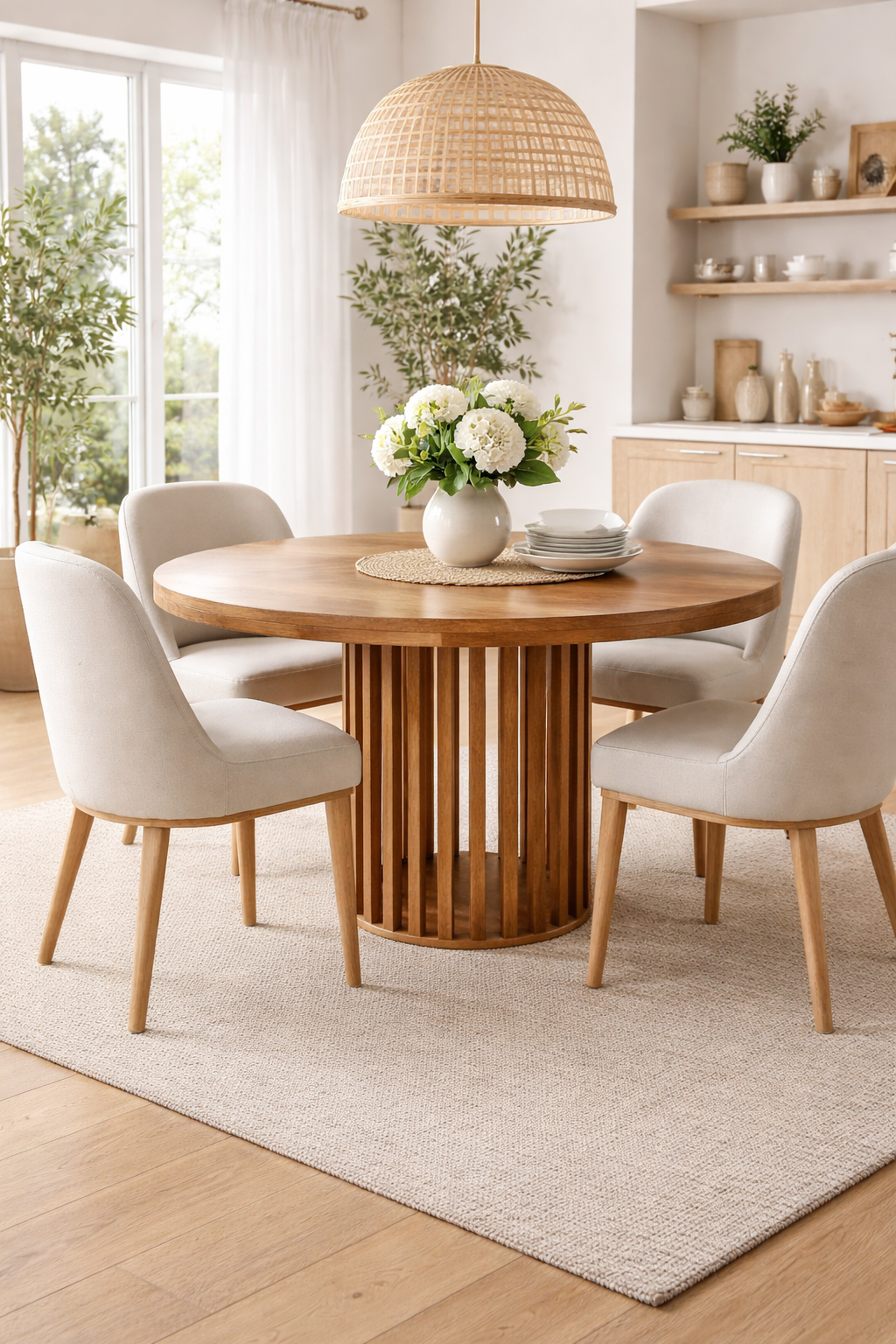 Designed with a sculptural slatted base, the Ariella allows light to flow effortlessly through its structure, lending a sense of openness and balance to your space. The round tabletop encourages conversation and connection, making it ideal for family meals, relaxed gatherings, and intimate dining experiences.