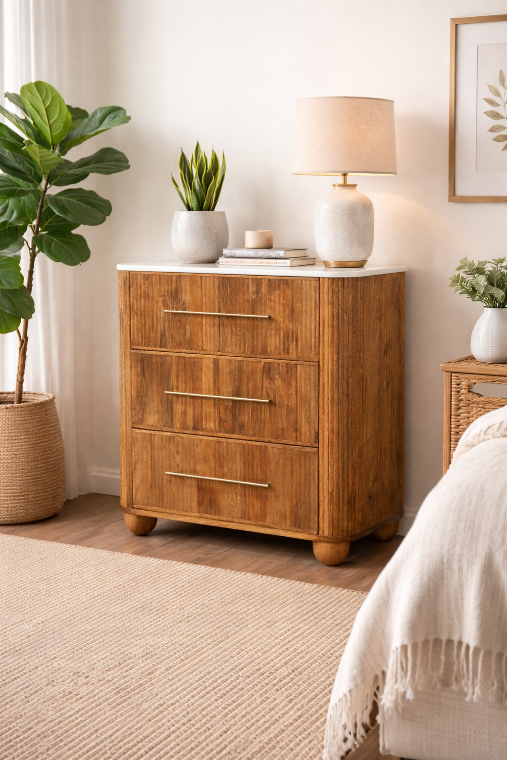 The front and sides are finished with a distinctive fluted texture, showcasing artisanal detailing and adding depth and character to the design. Four generously sized drawers provide ample storage for clothing, accessories, or household essentials, while the sleek brass handles introduce a subtle metallic accent that complements the warm tones of the wood.