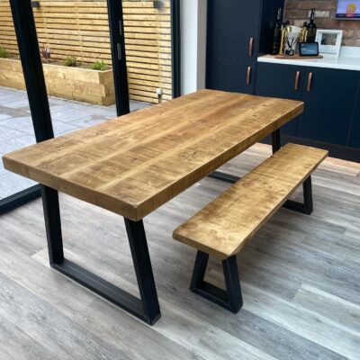 This table is made using our thicker 80mm wood paired with our thicker 100x30mm steel legs for that all round chunkier look. The legs are detachable for ease of delivery and attached on site. The table is extremely robust, sturdy and very heavy!