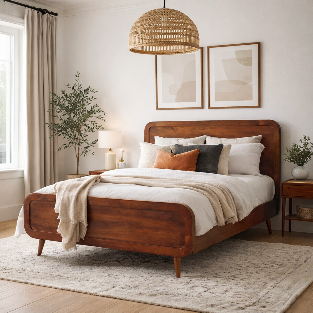 Bring warmth, elegance, and natural craftsmanship into your bedroom with the Curved Chestnut Mango Wood Double Bed. Beautifully crafted from 100% solid mango wood, this stylish bed frame features a rich chestnut finish that highlights the natural grain of the wood while adding a luxurious feel to any bedroom interior.