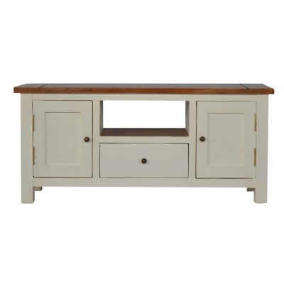 This two-toned media unit combines style and functionality, featuring a white hand-sprayed solid wood base paired with a rich honey-finished top. Designed for ample storage, it includes one drawer, two door cabinets, and a spacious shelf, along with a sturdy top perfect for placing a TV. Additional details such as shiny brass knob handles, straight farmhouse-style feet, and rich honey-finished drawer inners enhance its timeless appeal.