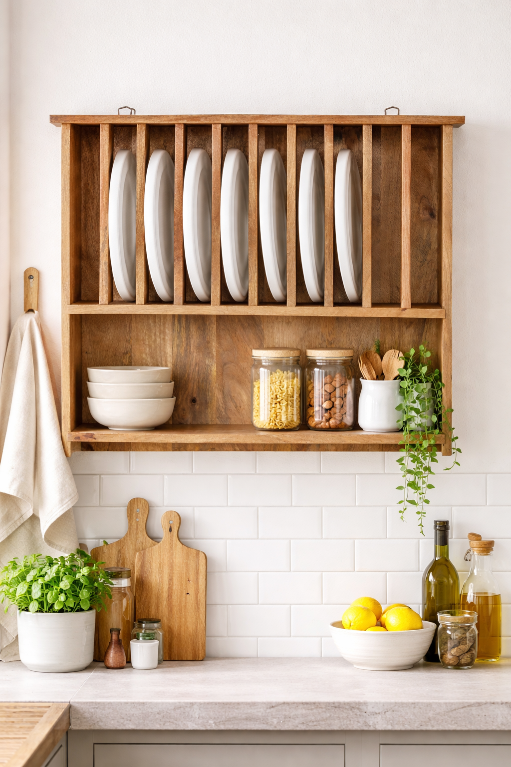 Floating Plate Rack with Shelf – Solid Mango Wood Kitchen Storage
