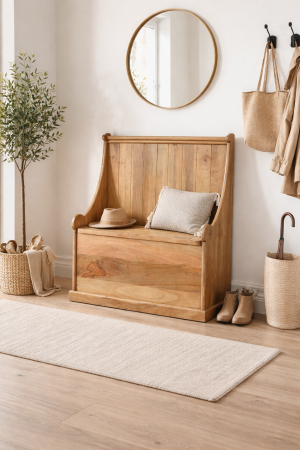 Finished with a hand-distressed oak-ish tone, each bench celebrates the individuality of the wood. Subtle variations in texture and colour give every piece its own unique character, highlighting the care and skill of the artisans who create it. This rustic finish makes the bench an ideal companion to both traditional and contemporary interiors.
