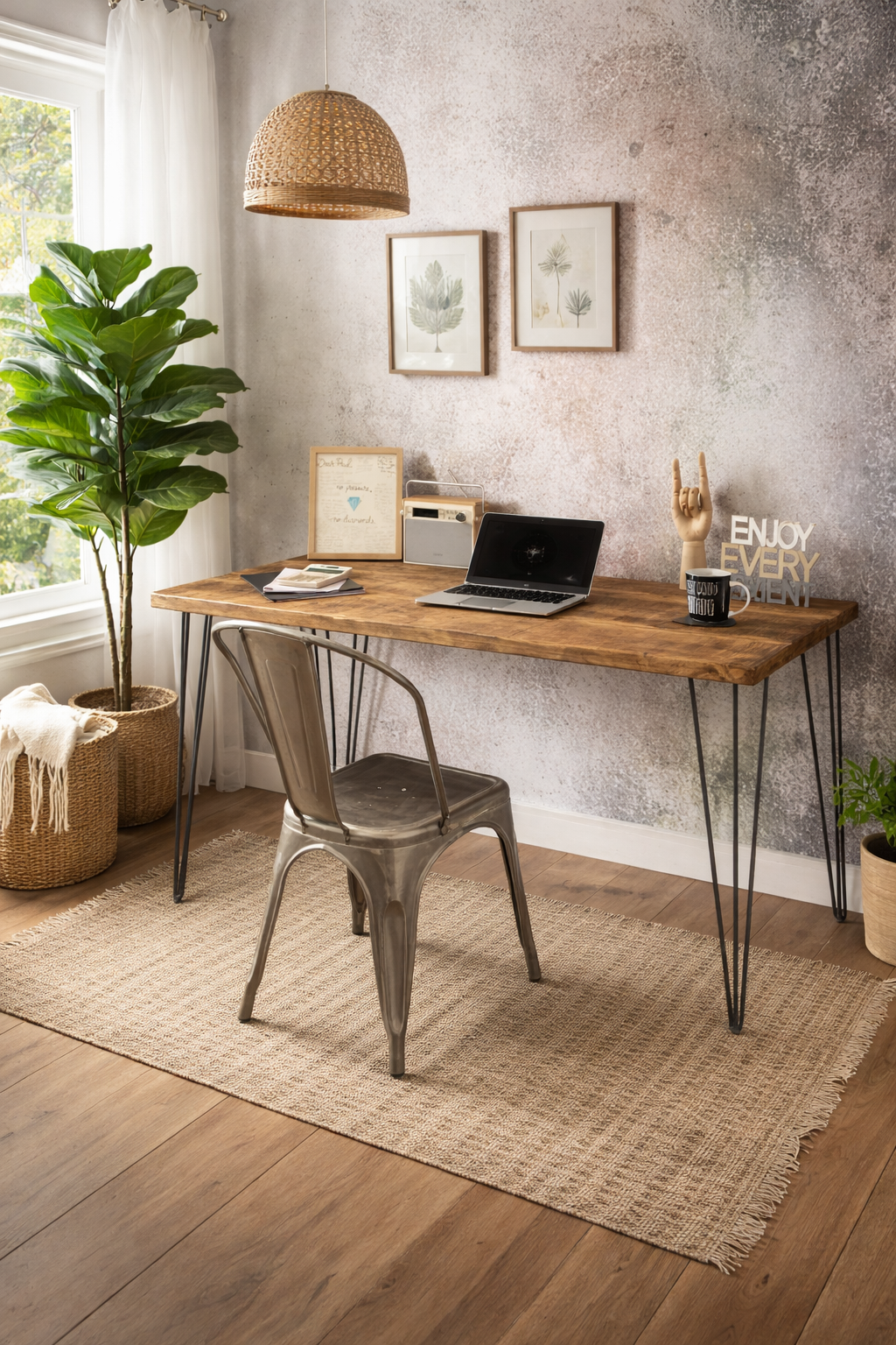 The Hairpin Leg Home Office Desk is a perfect balance of minimalist design and practical craftsmanship, making it an ideal choice for modern home offices, studies, and creative workspaces. With its clean lines and understated industrial influence, this desk offers a stylish yet functional workspace that fits effortlessly into a variety of interiors.