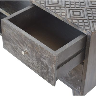 This media unit offers excellent storage with 2 open shelves and 4 drawers. Perfect for use in the living room when it comes to storing bits and pieces you wish to keep out of sight as well as things you wish to display on the open shelves. Constructed from 100% solid wood in a ash black finish it features Nordic style legs and shiny brass knobs.