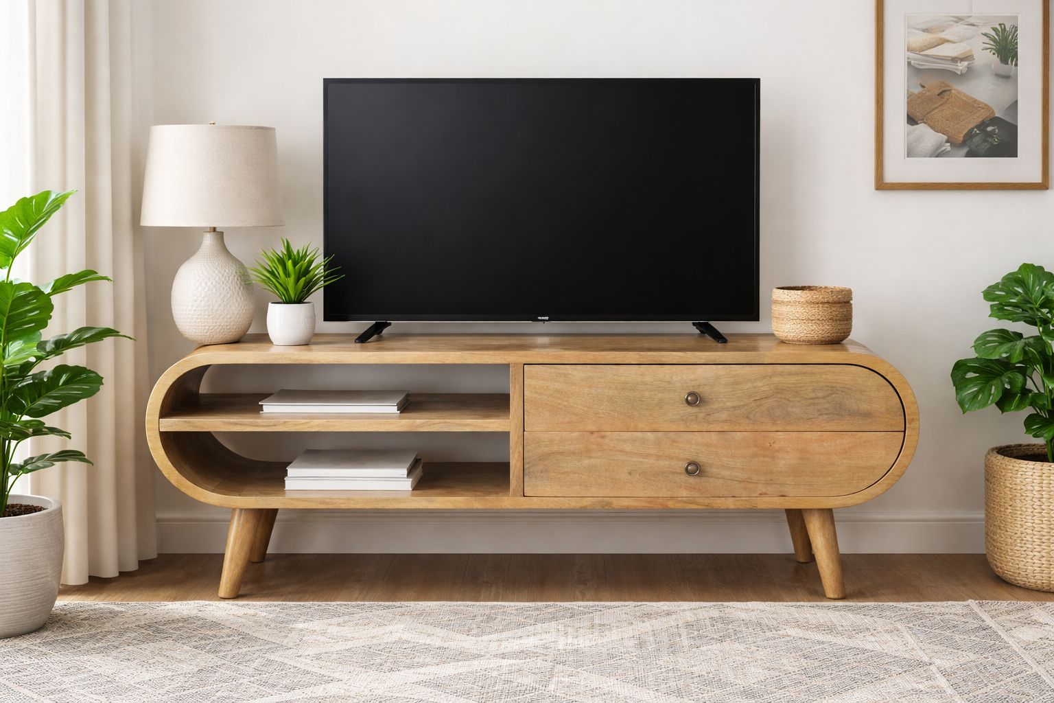 Bring Scandinavian minimalism and timeless elegance to your living space with the London Media Unit. Expertly crafted from 100% solid mango wood with a warm oak finish, this round-style media unit combines functional storage with refined design, creating a stylish focal point for any living room.