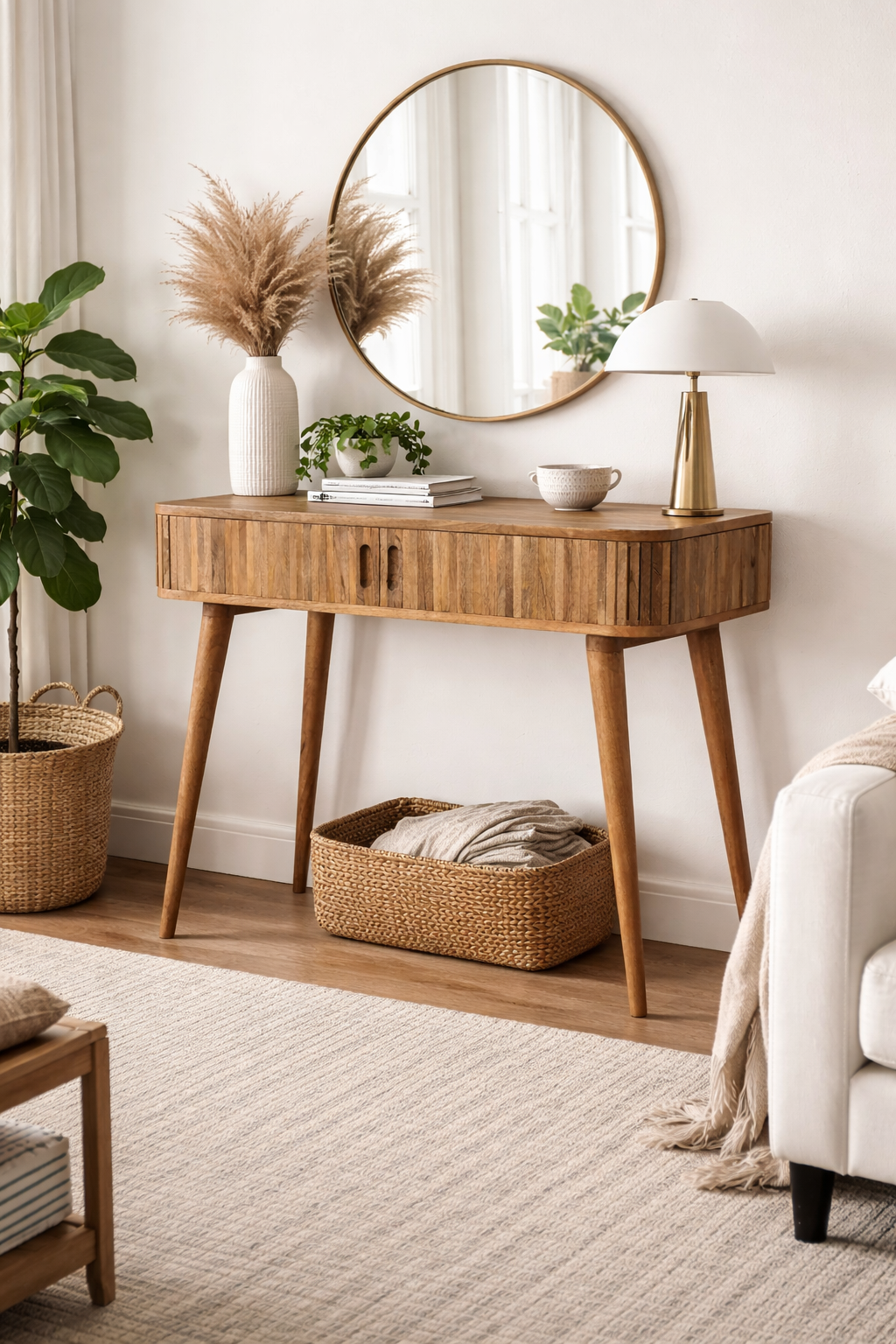 Thanks to its versatile design, this piece can be used in multiple ways throughout the home. It works beautifully as a hallway console table, a compact home office desk, or even a stylish dressing table, adapting effortlessly to your needs and space.