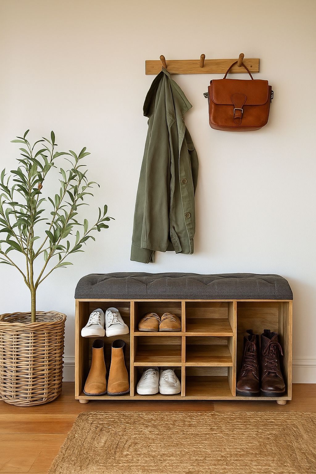 This open storage bench emanates a charm that is both rustic and refreshingly modern; its oak-ish body reflects an understated elegance that complements a diverse array of interior decors. Standing proudly on four Nordic-style legs, the piece embodies an air of sophistication that is emboldened by its Scandinavian influences.