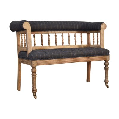 Enhance your living space with the elegance of this country-style hallway bench. Crafted from 100% solid mango wood, it is upholstered in luxurious pewter tweed for a sophisticated touch. Featuring intricately hand-carved and hand-turned front legs with casters, along with a warm oak-ish finish, this bench seamlessly combines style, comfort, and practicality.