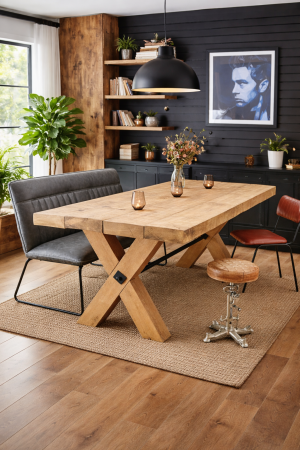 Beautiful solid wood dining table with our ‘Steel Hemlock’ X base design, all crafted here in the UK.