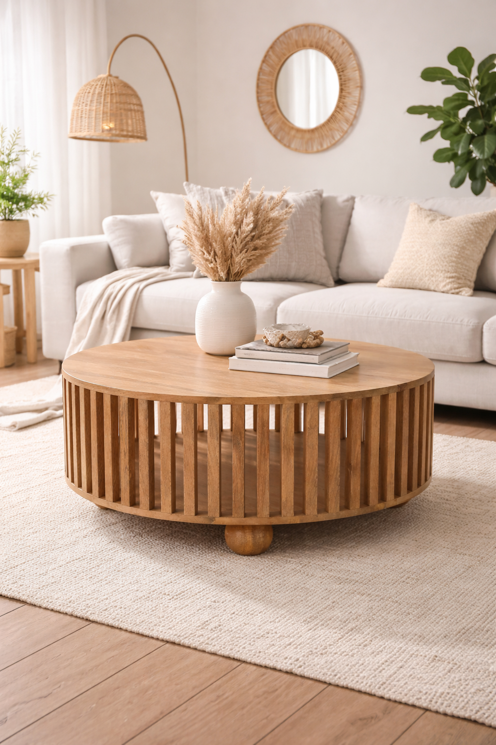 Add warmth, texture, and contemporary style to your living space with the beautifully designed Slatted Round Oak-ish Coffee Table. Expertly handcrafted from 100% solid mango wood, this statement piece blends modern design with natural materials to create a timeless centrepiece for your home.