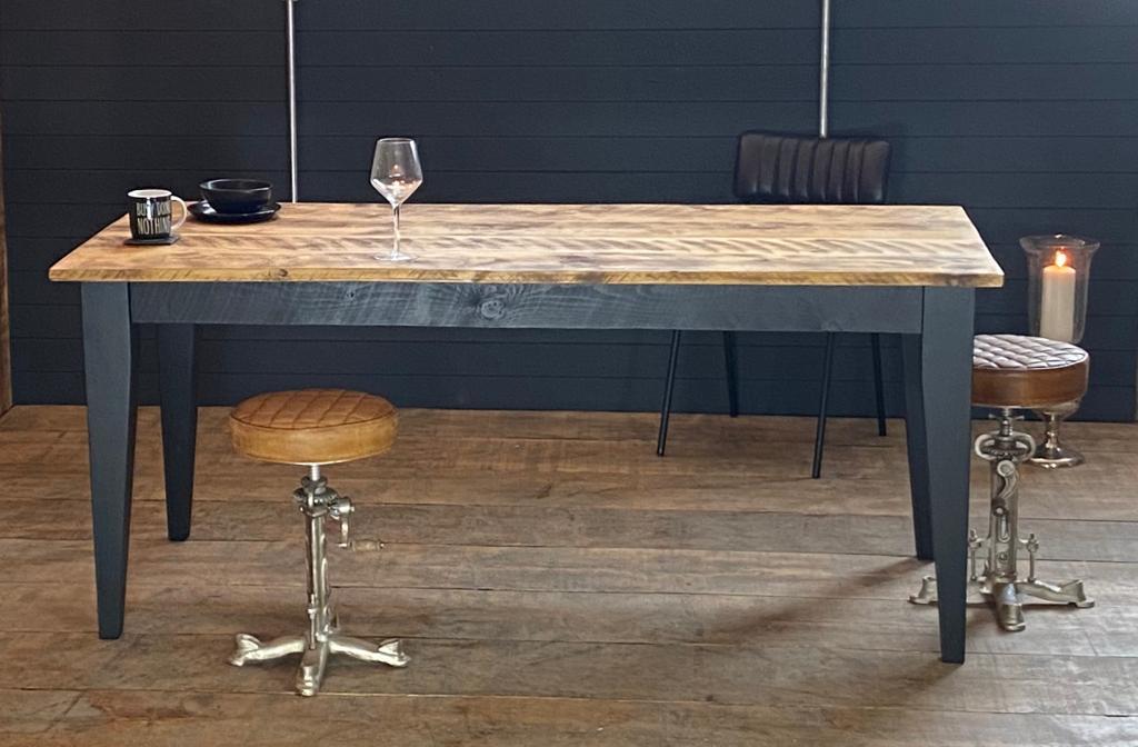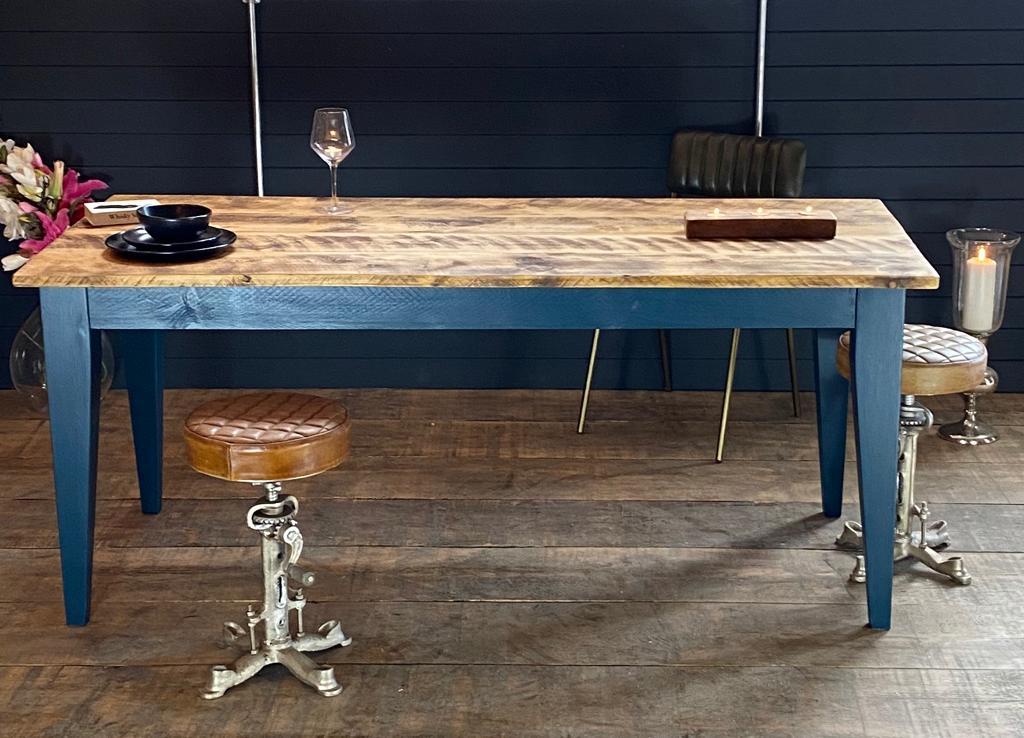 Our new ‘Farmhouse’ tables with hand waxed, reclaimed timber tops and chamfered legs, painted in Farrow and Ball paint in one of three options. ‘Railings’, ‘Pitch Black’ or ‘Hague Blue’.