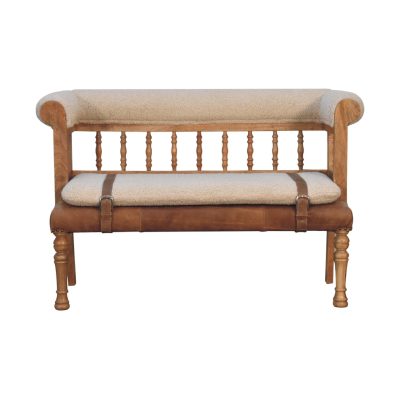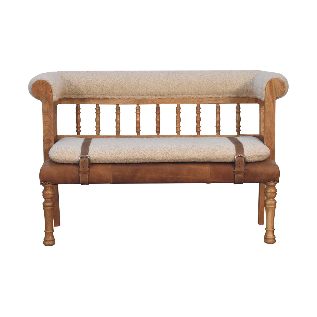 Constructed using 100% solid mango wood with a natural oak-ish finish, this bench celebrates the beauty of sustainable materials through its robust silhouette and rich, inviting tones. The cream boucle upholstery, a testament to time-honored textile artistry, provides a plush seating surface that contrasts delightfully against the wooden frame, promising an opulent yet cozy welcome.