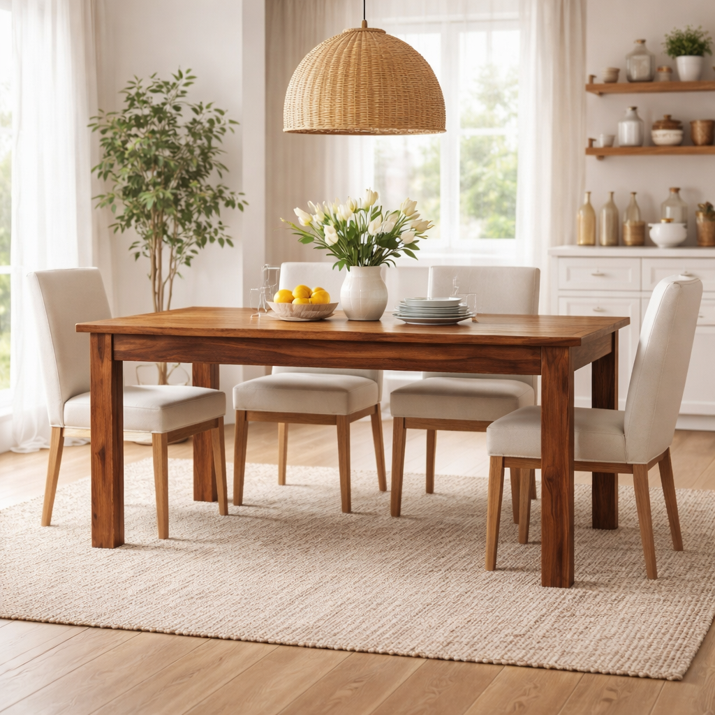 Renowned for its strength and striking natural grain, Sheesham wood ensures that each Tula Dining Table is truly one of a kind. The solid construction promises exceptional durability, making this table a long-lasting centrepiece in your home. Its smooth, generously sized tabletop offers ample room for dining, serving, and socialising, while the sturdy legs provide dependable stability and support.