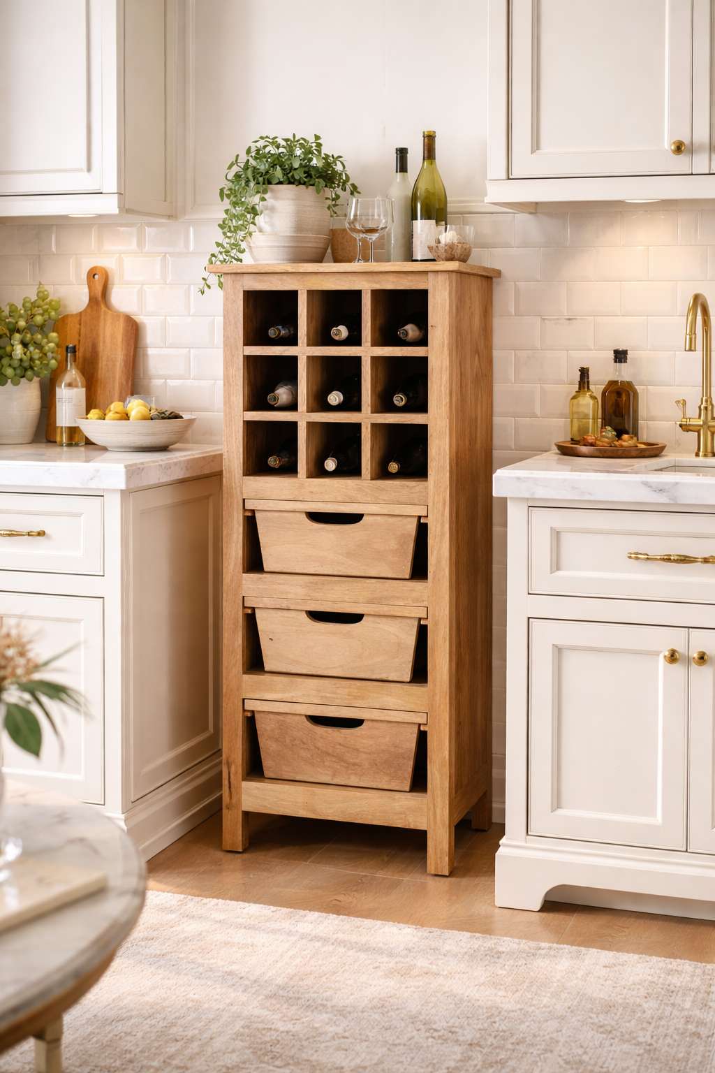 Designed with smart storage in mind, the cabinet features three smooth-gliding drawers for cutlery, linens, or accessories, alongside nine dedicated wine bottle slots to keep your collection neatly organised. Below, three open lower shelves provide generous space for wine bottles, groceries, or kitchen essentials, offering both versatility and convenience.